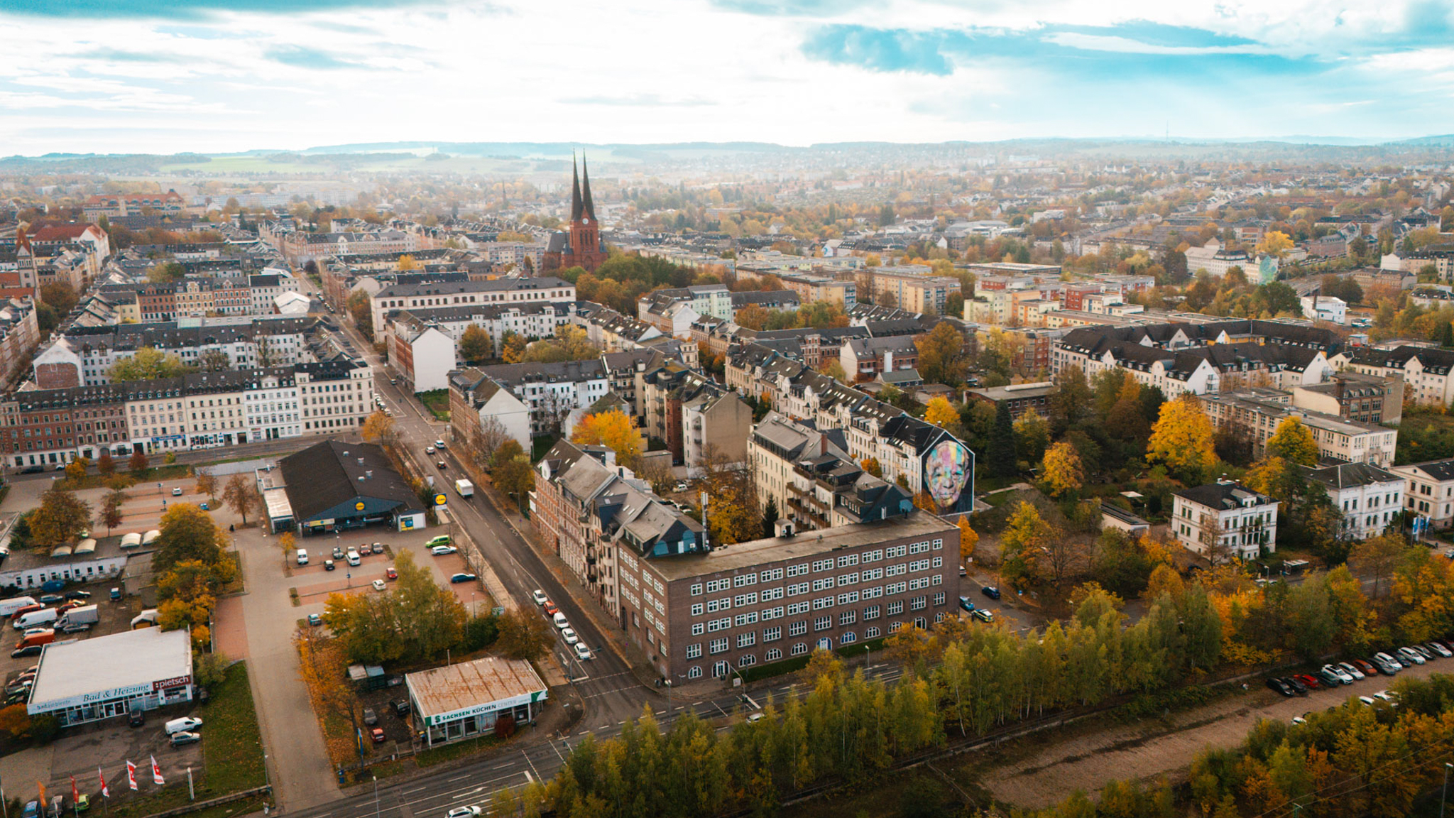 Blick von oben auf das Bürogebäude auf der Glockenstraße in Chemnitz