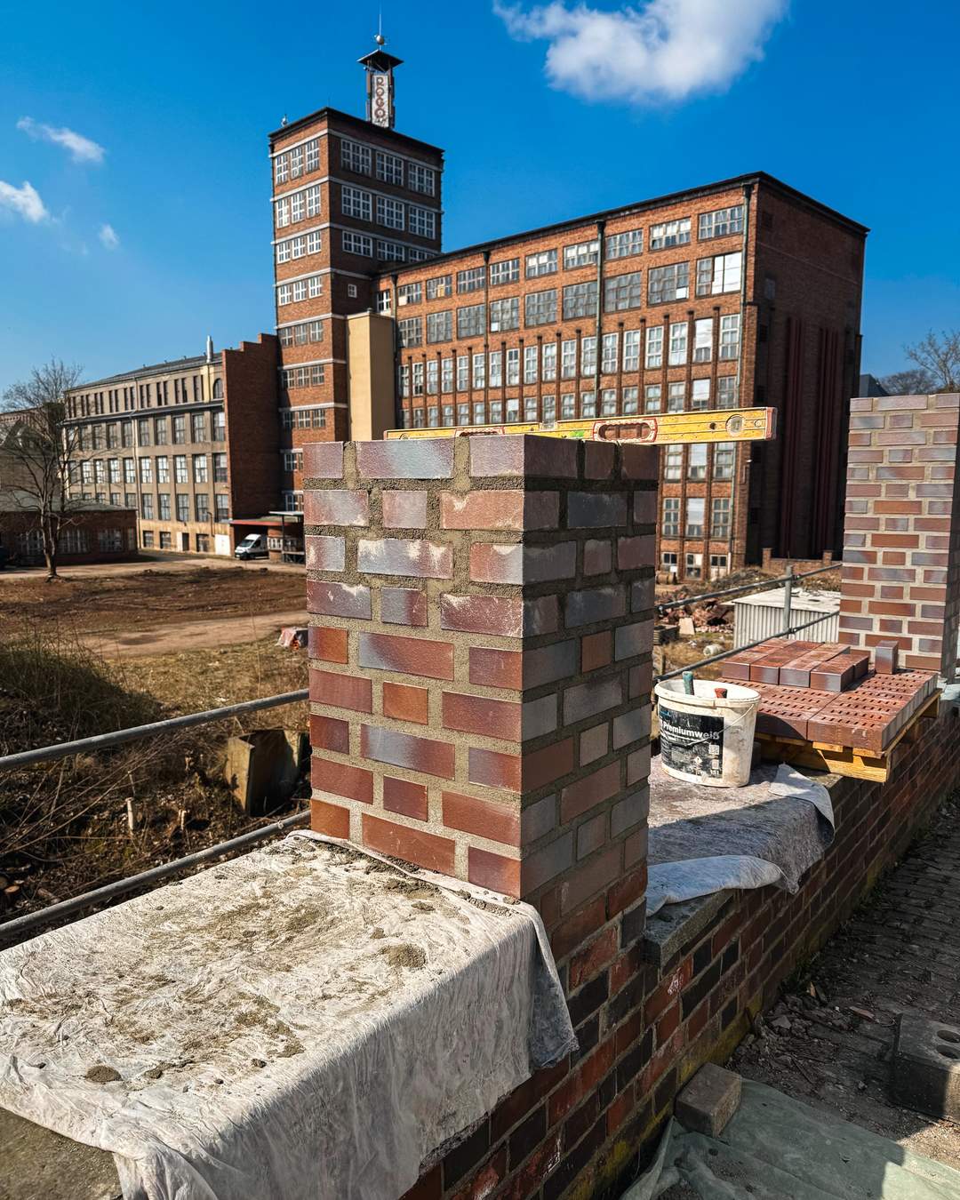 Detaillierte Nahaufnahme eines neu errichteten Ziegelpfeilers, der auf einer Mauerkrone steht. Im Hintergrund erstreckt sich die große, historische rote Backsteinfabrik mit ihrem Uhrturm unter blauem Himmel.